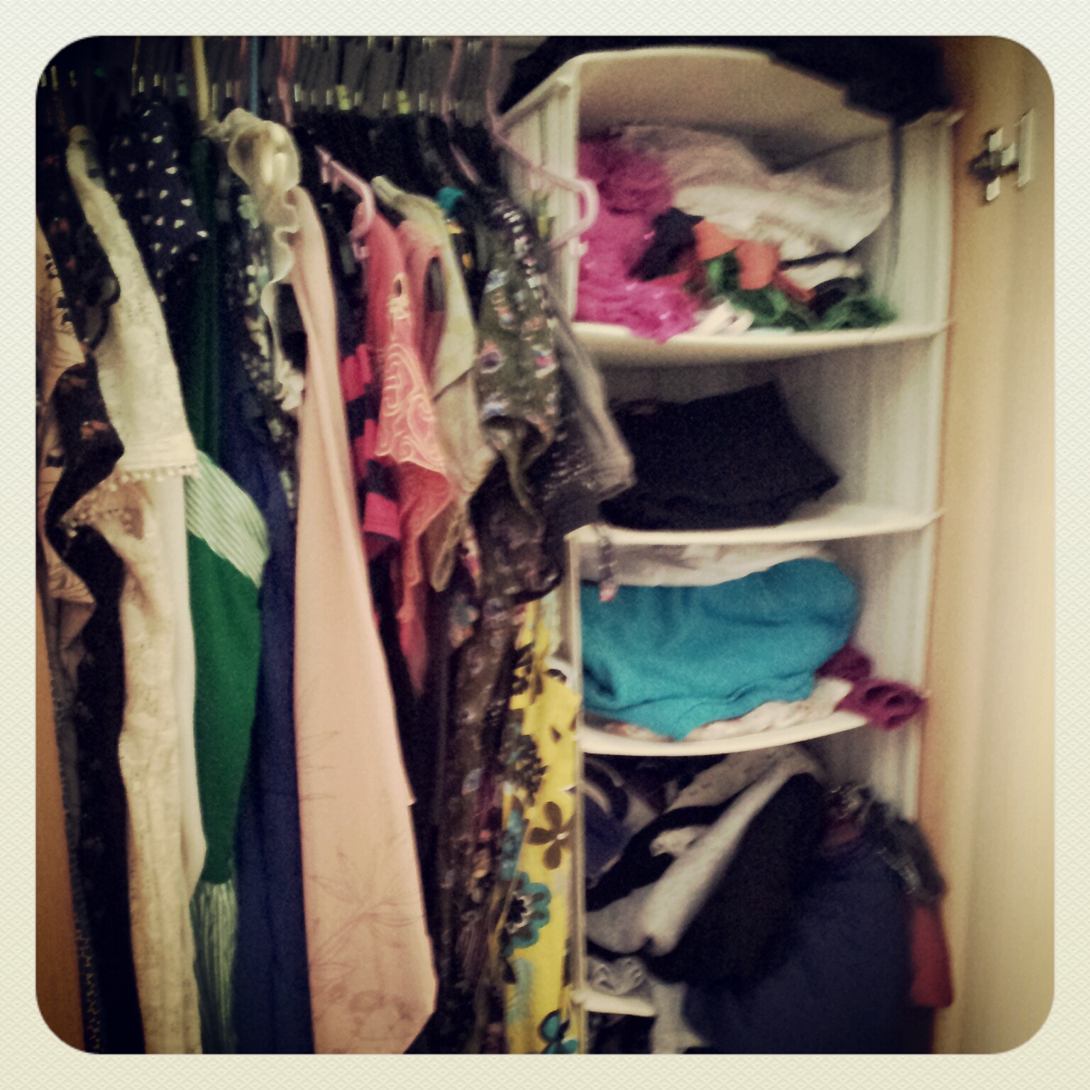 I didn't manage to do it yesterday since I was going to do it after work, but then I stayed on till just after midnight and by the time I came home I was too tired so I've done the first two today. The photo at the top is of my wardrobe, which was the first day. It's got drawers on the bottom which are broken and empty, and only fits about a third of my clothes into it. I have an out of date Chinese calender I got for free on one door since its pretty and its easy to find out someones Chinese sign if I so wish. But I should probably change it soon. I also have some china ballerina slippers which you can barely see that I've had since I was about 8, which were given to me by my nana.